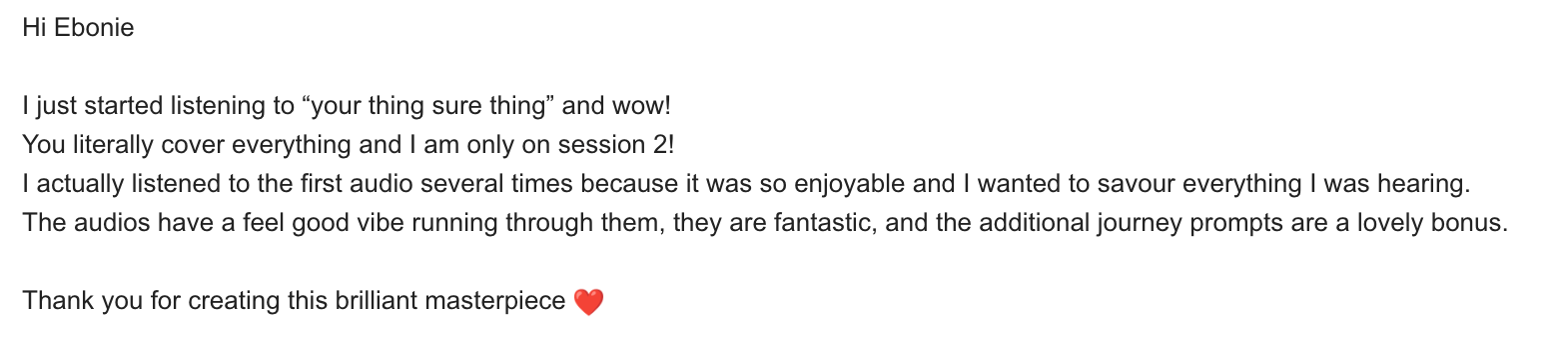 Ebonie has an uncanny way of prompting what you need at just the right time. Her way of guiding the conversation creates space for you to challenge yourself and answer tough questions whilst making it easy. I feel reacquainted with the parts of me that matter and equally surprised by some new realisations. Your Thing Sure Thing has left me feeling empowered, motivated and already seeing benefits of making different choices